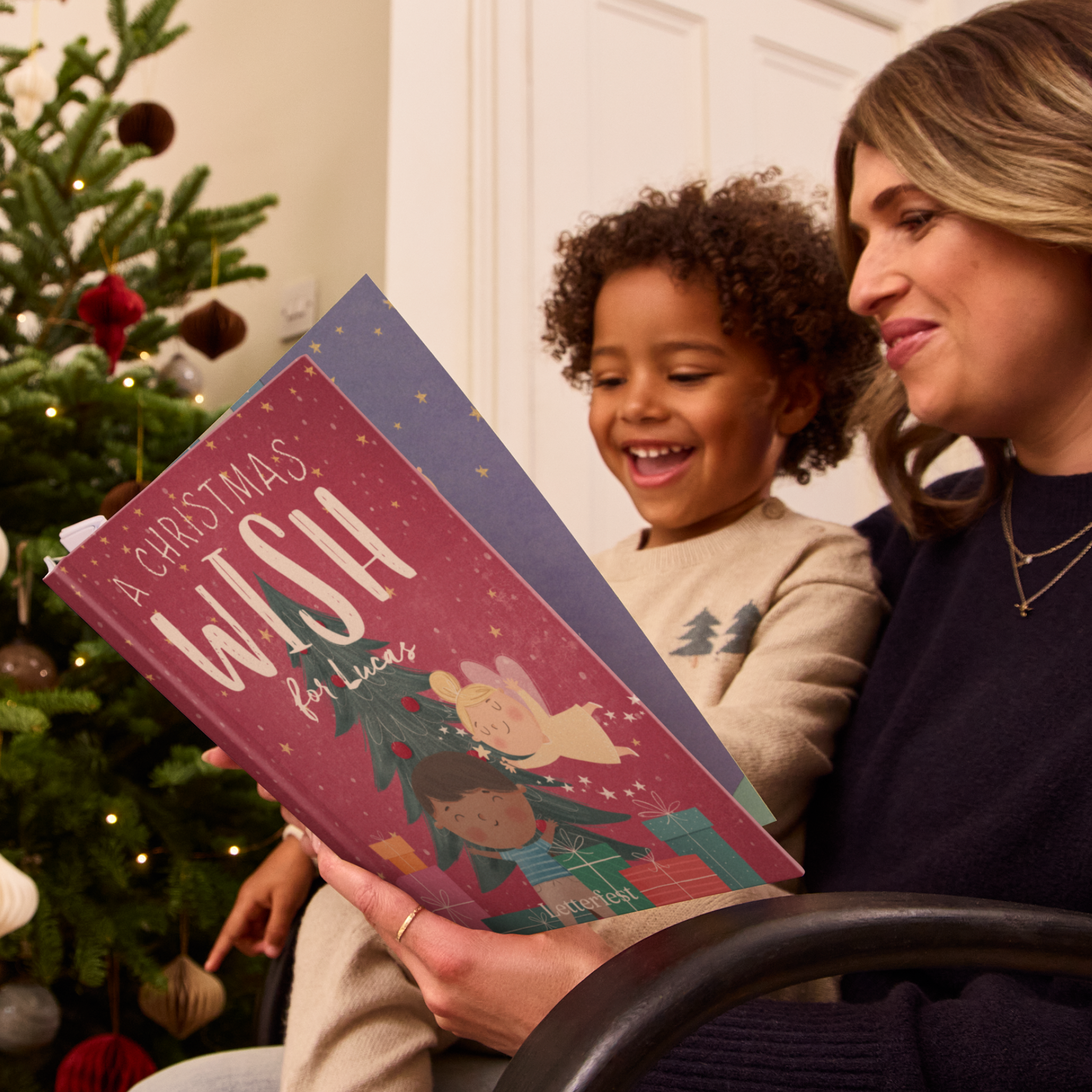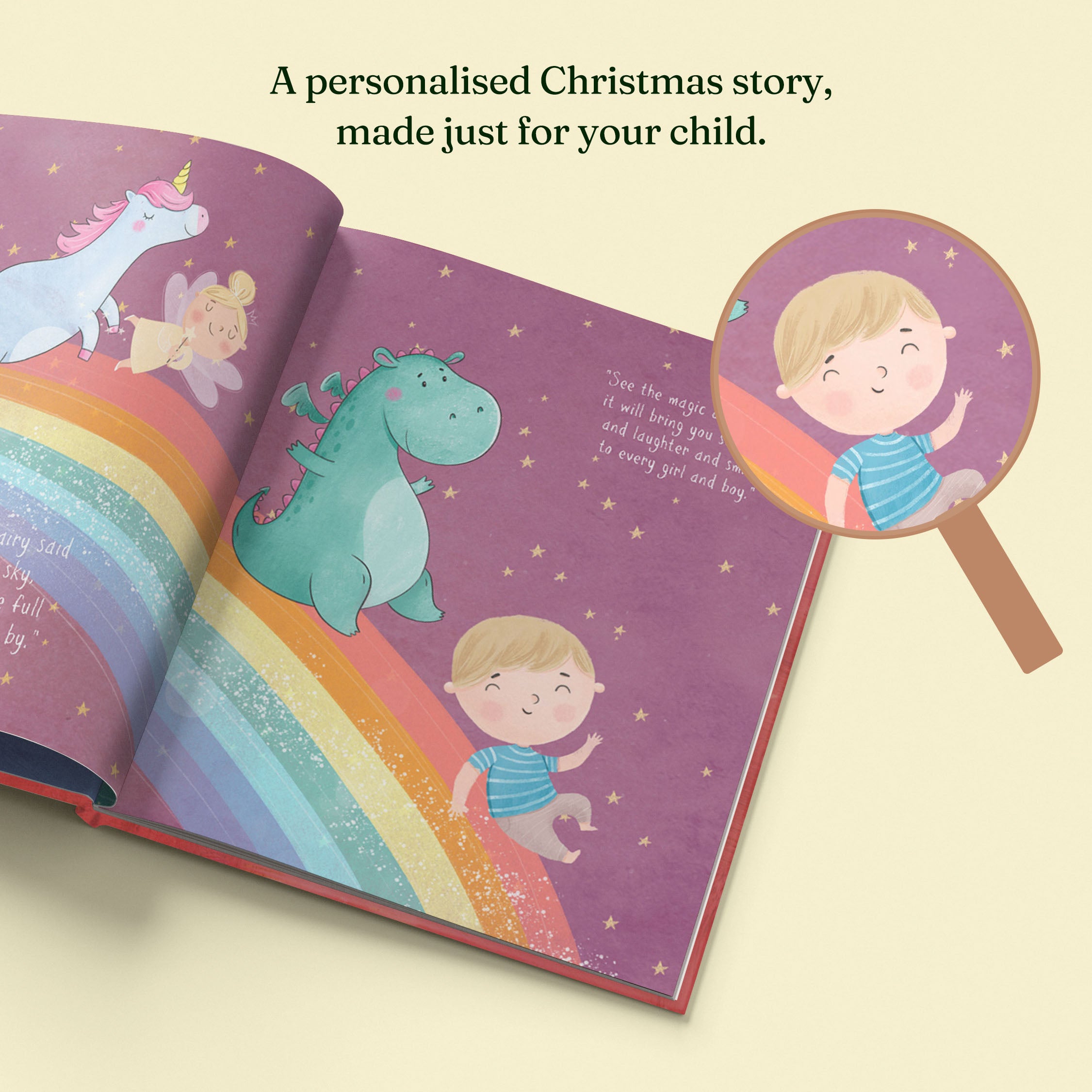 Choose from our range of characters to best suit your child, selecting from skin tones and hair colors. Illustrated with gorgeously bright illustrations, your child is joined on their adventure by a unicorn and dragon. On the inside front cover we print a personalized message so they can treasure the book as a keepsake in years to come, for example: "Christmas 2024 - with love from Mommy and Daddy xxx"