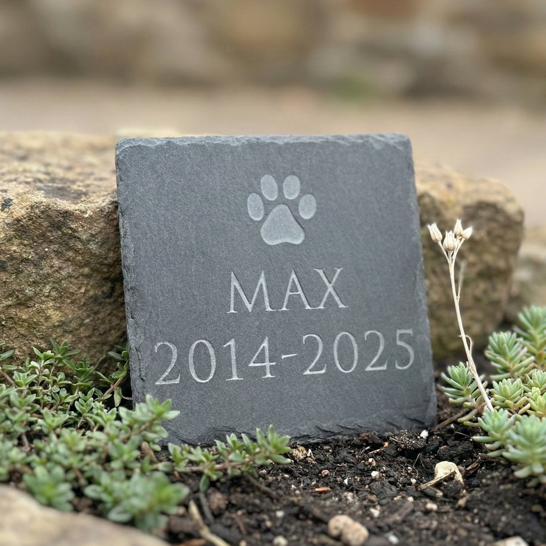We can engrave their name and the date underneath (optional). The slate can be displayed in the garden or house.