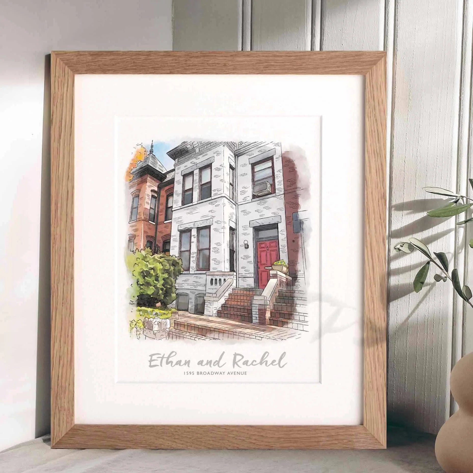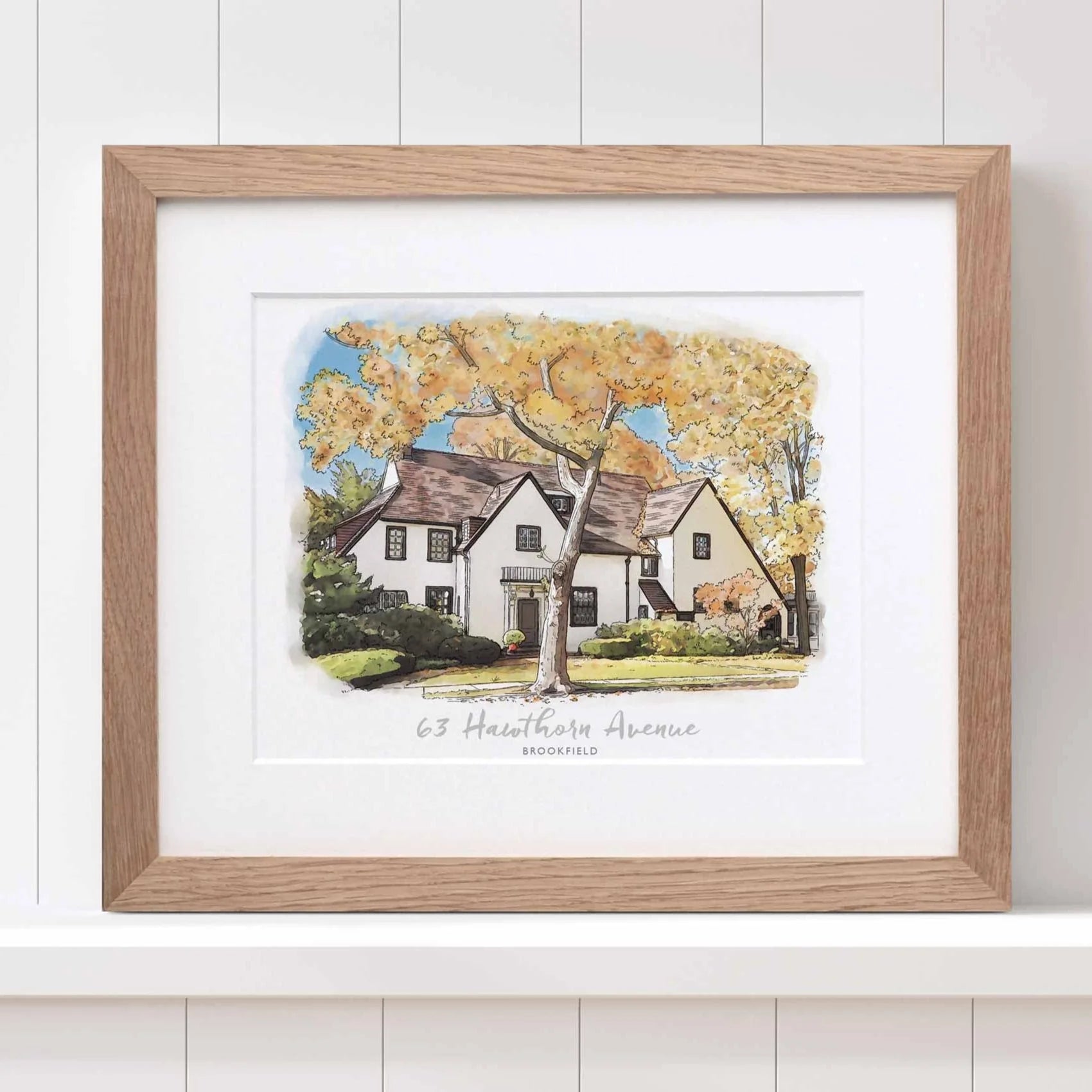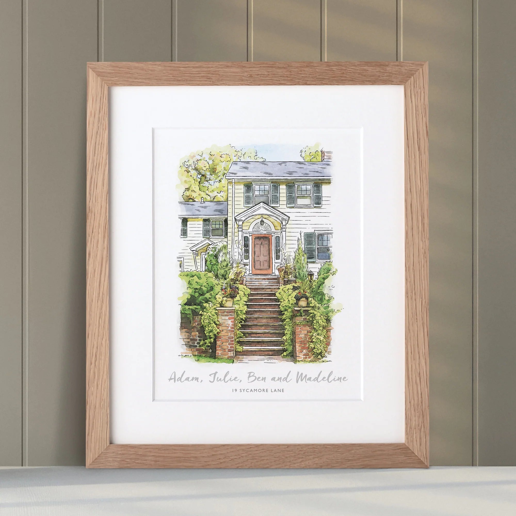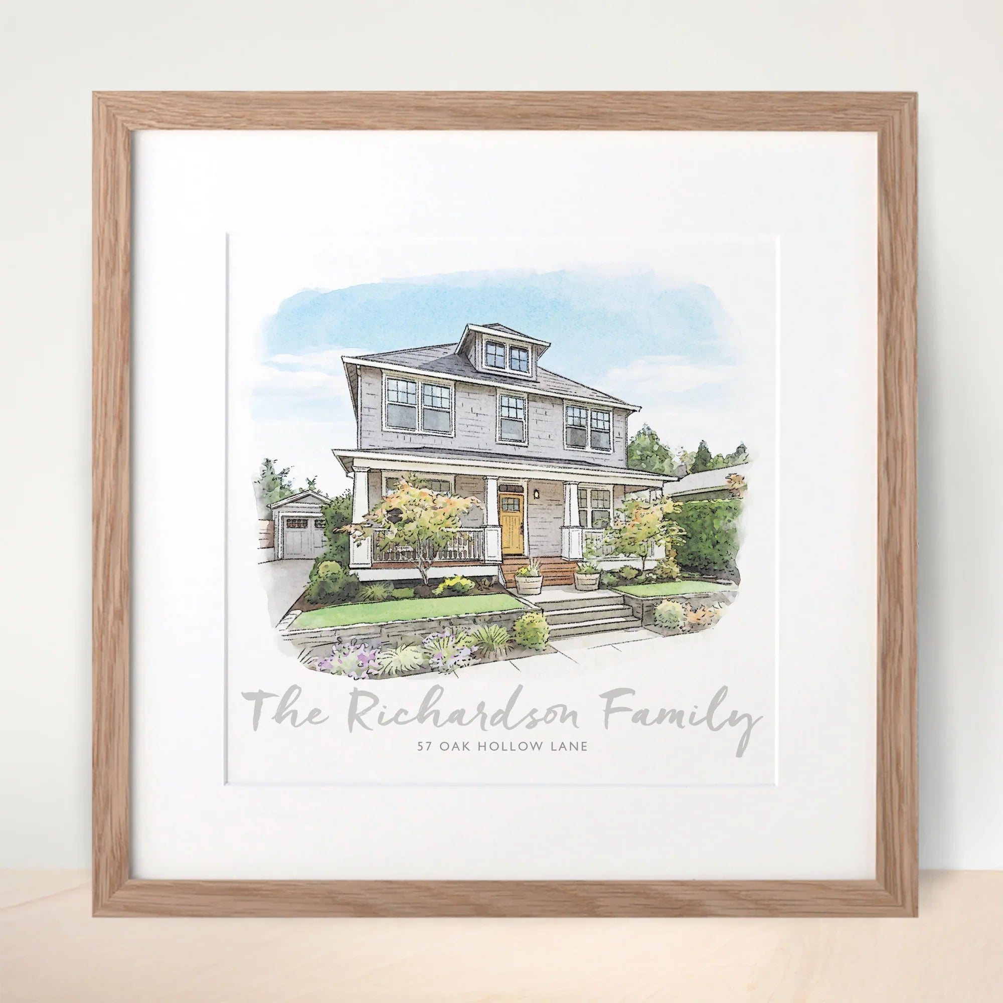 A personalized watercolor sketch of your house, hand-drawn by artists, printed on luxury Italian paper with your choice of text.