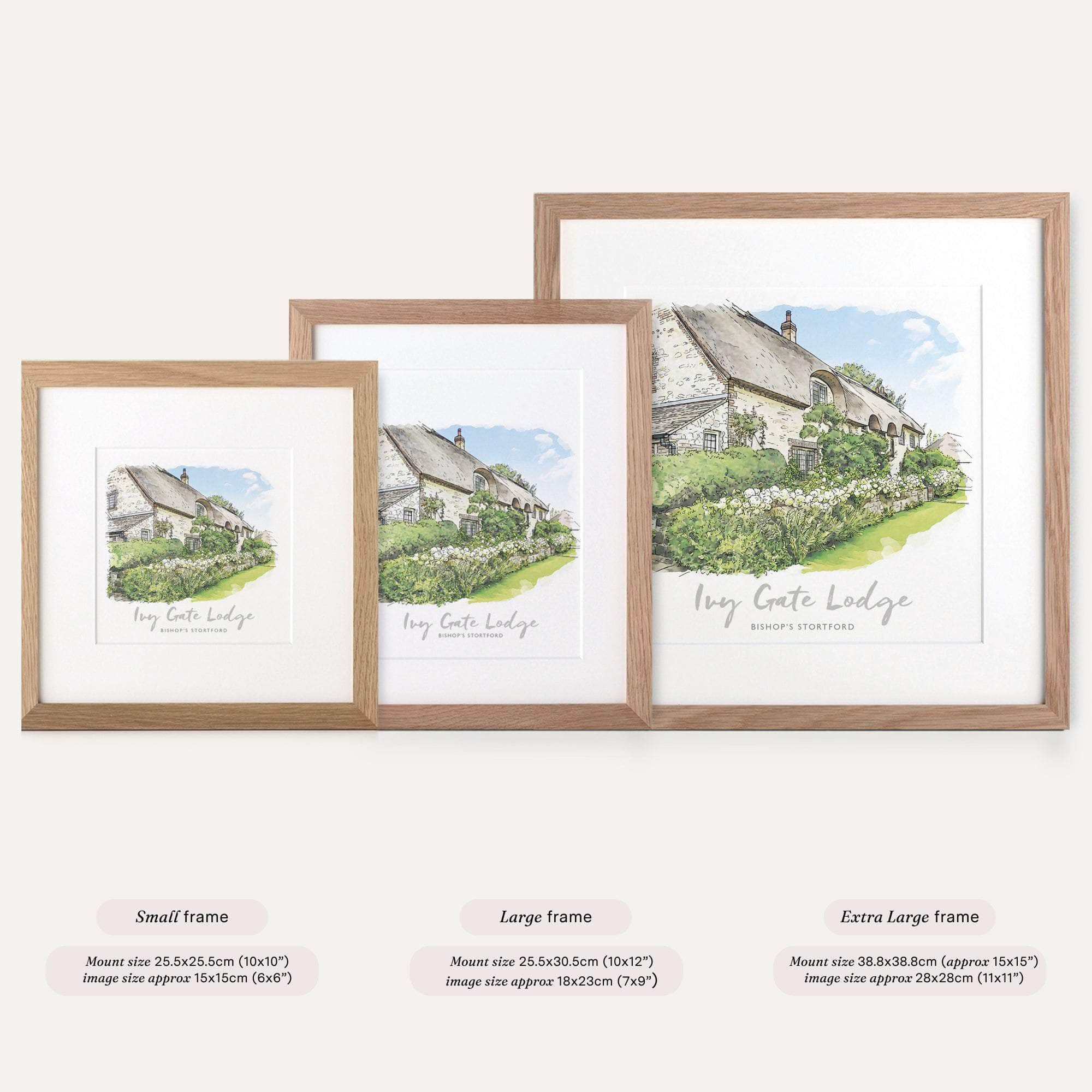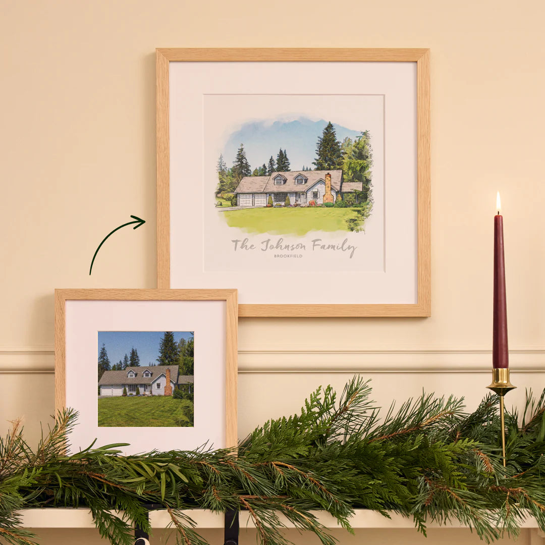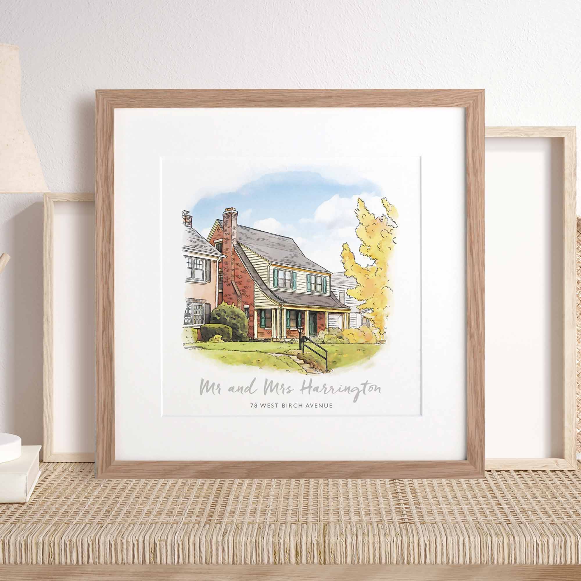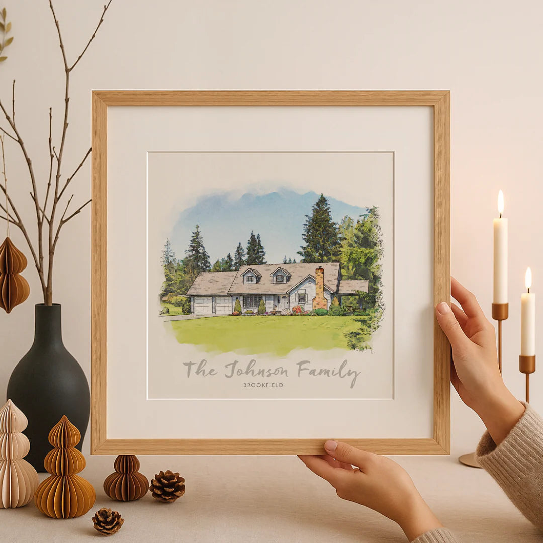 A personalized watercolor sketch of your house, hand-drawn by artists, printed on luxury Italian paper with your choice of text.