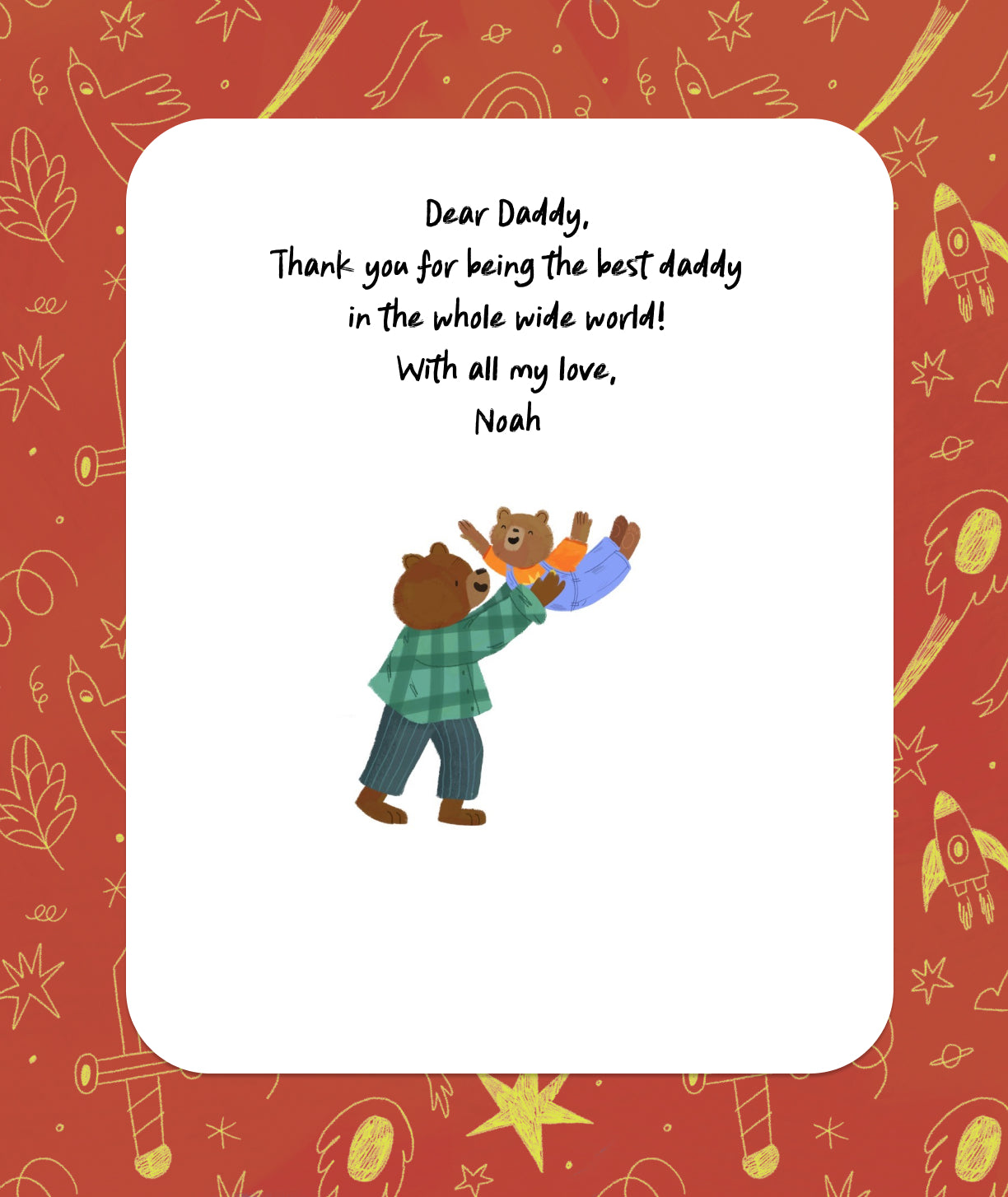 Illustrated with stunning drawings of a bear family printed over vibrant adventure filled backgrounds. Each page is packed with magical moments for Daddy and his little one to enjoy. You choose the adventures by selecting the images above and weโ€™ll take care of the rest. Celebrate a special relationship this Father's Day.