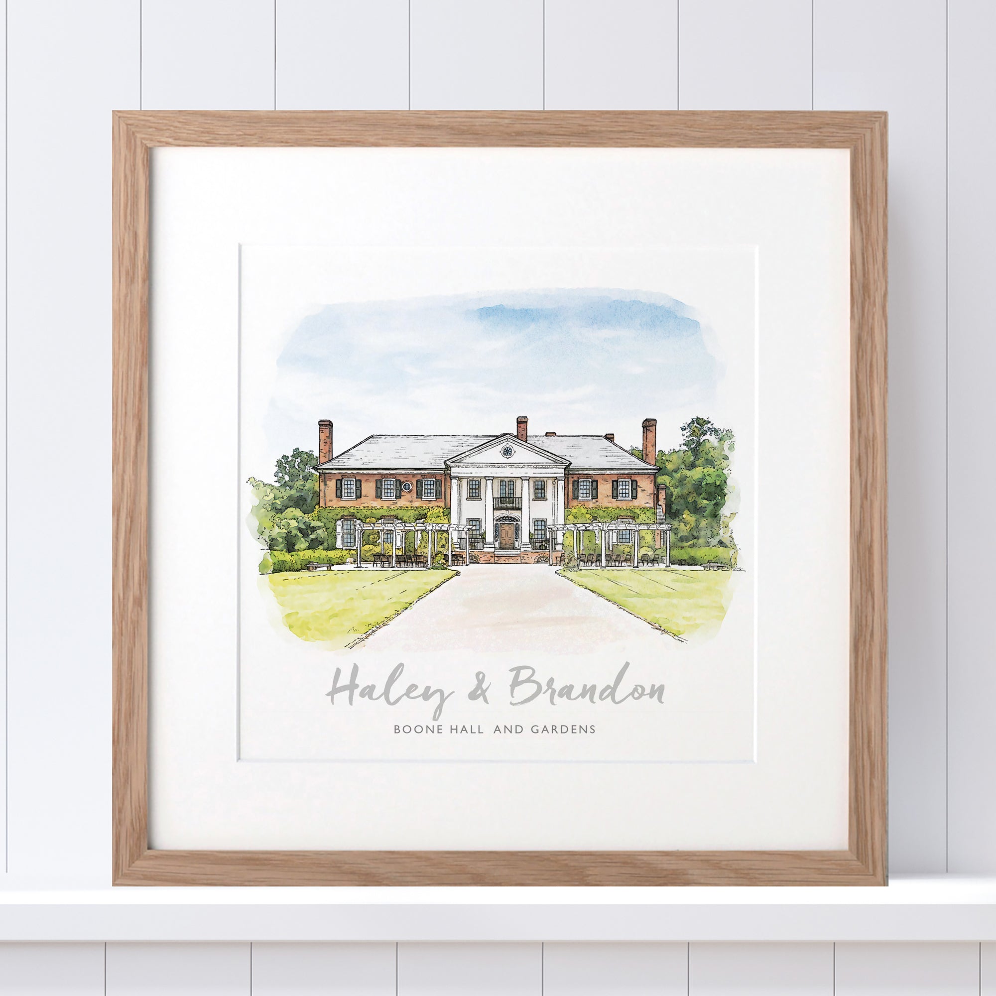 If you’re looking for the perfect wedding gift that isn’t the traditional kind, you’ve found the right place! Our bespoke wedding venue illustrations are sure to take pride of place in the happy couple’s home. Each painting is personalized with the couple’s names and special dates. We offer a variety of illustration styles to suit any aesthetic, from traditional sketches to stylish watercolors. Crafted using the finest artists’ grade paper, it also makes a thoughtful and unique first wedding anniversary gift—perfect for the paper theme.