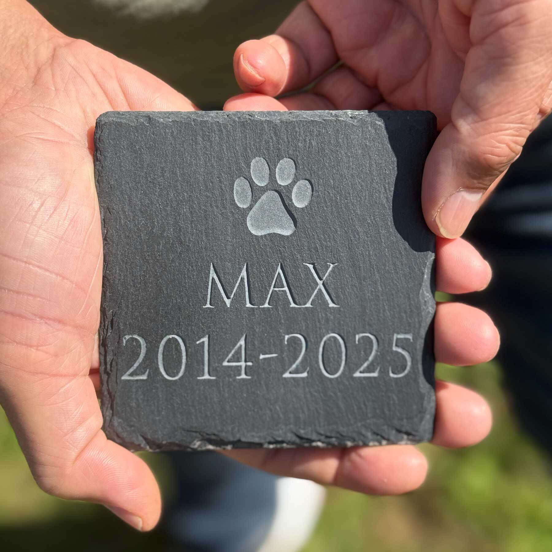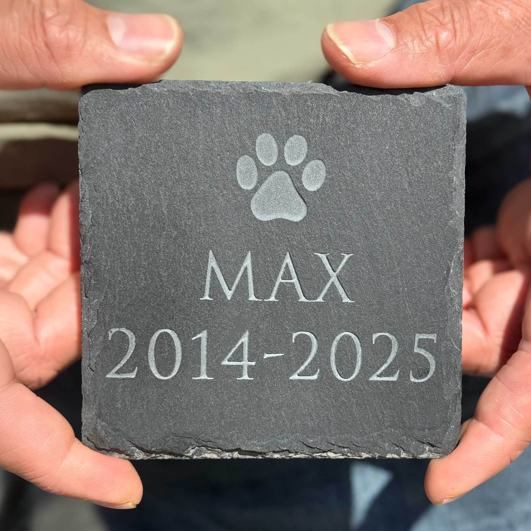 A natural stone slate engraved with a paw print and wording of your choice - a perfect keepsake for that special pet.