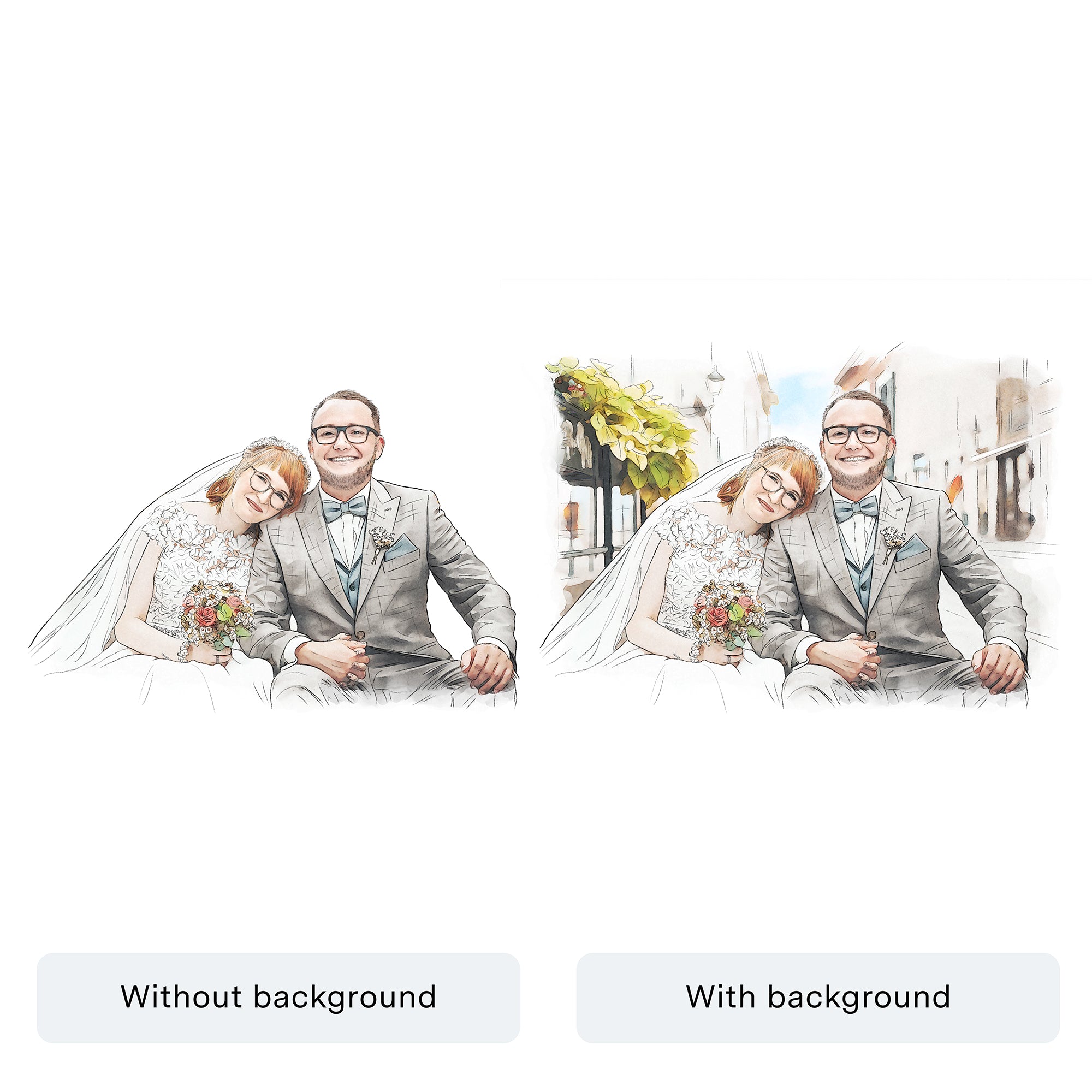 The portrait will be drawn from a photo provided by you. Backgrounds in the photograph can be included for an additional cost. Select how many people you would like drawn from the dropdown list.