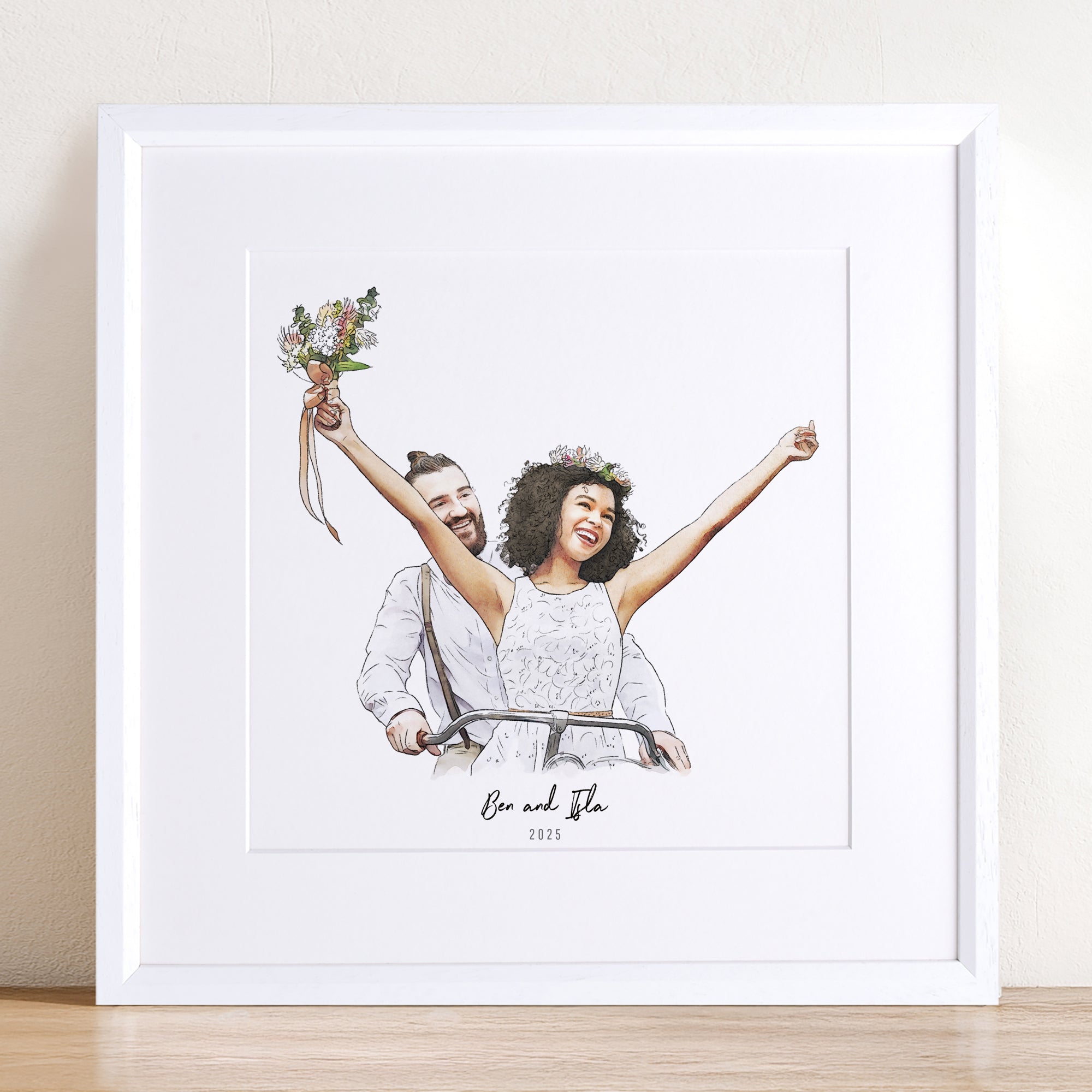A graphic, hand-drawn, black and white line illustration of the bride and groom - a gorgeous wedding, anniversary or Christmas gift.